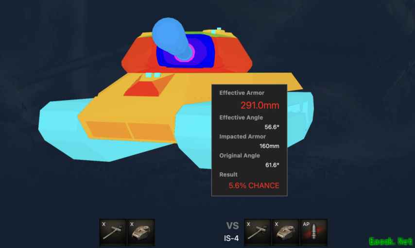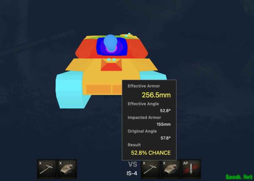 IS-4的装甲是其最大亮点,堪称 “S系之盾”。正面首上装甲纸面数据是155毫米,但是它的等效装甲可达260毫米左右,同级重坦的银币弹很难正面击穿。 首下装甲的等效在230毫米左右,虽不如首上坚固,但合理藏首下(如利用斜坡只露首上)时,能大幅提升生存能力。