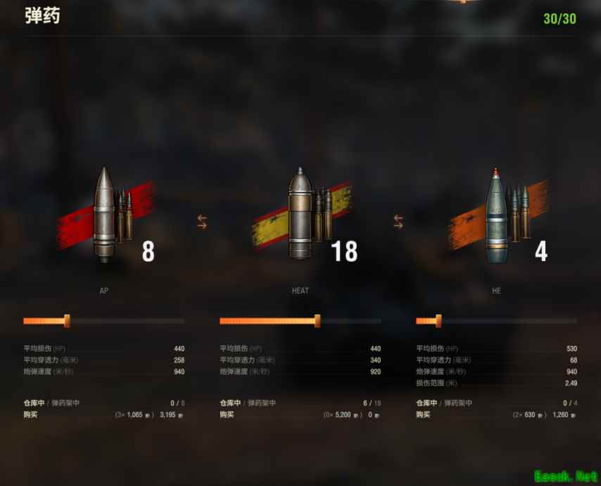 它的炮弹穿深分别为: AP:258毫米 APCR:340毫米 HE:68毫米 其中HE均伤为:530点 AP弹穿深258毫米,面对同级重坦的正面装甲会稍显乏力,要以打细瞄弱点为主。 HEAT弹穿深340毫米,对付10级重坦如鼠式或E100等,都有很高的击穿率! 在面对9级重坦的正面时,击穿能力非常优秀。 HE弹穿深68毫米,均伤530点,打脆皮车(如轻型坦克、自行火炮)时能造成非常多的伤害。 精度方面,0.4左右的精度在近距离搏斗的时候还是够用的,但移动或转动炮塔时扩圈明显,远距离射击需要耐心等待缩圈,避免 “随缘开炮”。 远距离的话还是靠的“信仰”。缩圈时间约2.4秒左右,打远处目标的话还是要稍微等待一会缩圈哦~ 生存
