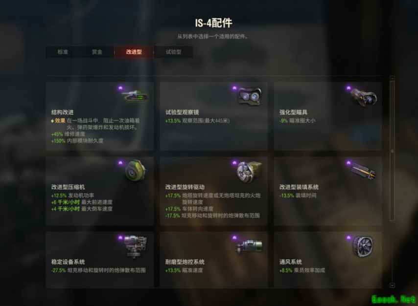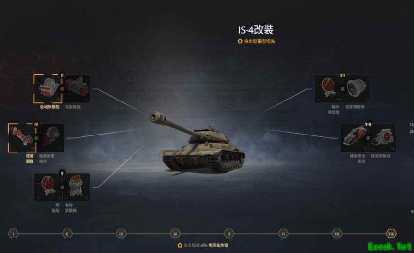 IS-4的机动性还不错:前进极速43千米/时,倒车极速14千米/时。 实际驾驶中,加速平稳,转向速度中等,小范围转场、补位时都能迅速到达位置,大范围转场虽然较慢,但能稳定跟上队友推进的节奏。 总体而言,它不适合单独长途转场,更适合在固定战线或小范围区域内发挥作用。 配件