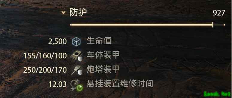 炮塔正面装甲厚250毫米,炮盾部分等效超过380毫米,是全车最硬的区域,卖头对炮时几乎不用担心被击穿。 侧面装甲160毫米,并且侧面有较多的黑洞装甲。对HEAT弹种的抗性非常的强,摆好角度后能跳同级重坦的金币弹。 生命值在2500点,在10级重坦中处于第一梯队,配合它的装甲,使其能轻松承担抗线的重任。