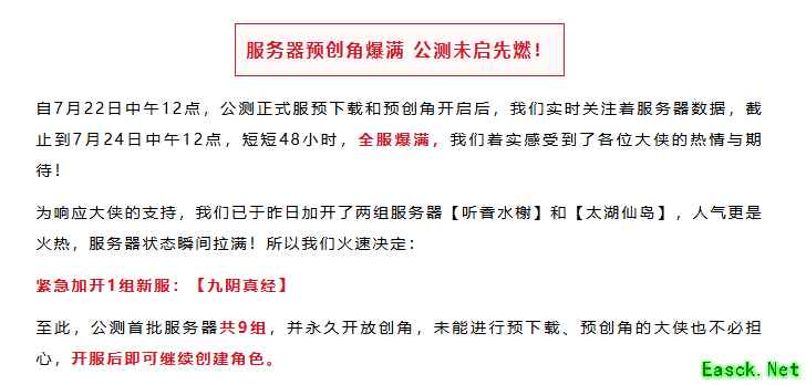 上线后,洛阳城里的盛况,就一个字:挤! 我选的是【半城烟沙】,满屏幕都是人人人人人……我甚至怀疑,怪刷出来的速度,都赶不上玩家出生的速度。 官方后来发战报,说预创角的时候,服务器就全线爆满了。 所以昨天连夜加开了【听香水榭】和【太湖仙岛】,结果瞬间又被拉满。今天更是火速加开了【九阴真经】,现在公测首批服务器已经有9组了!