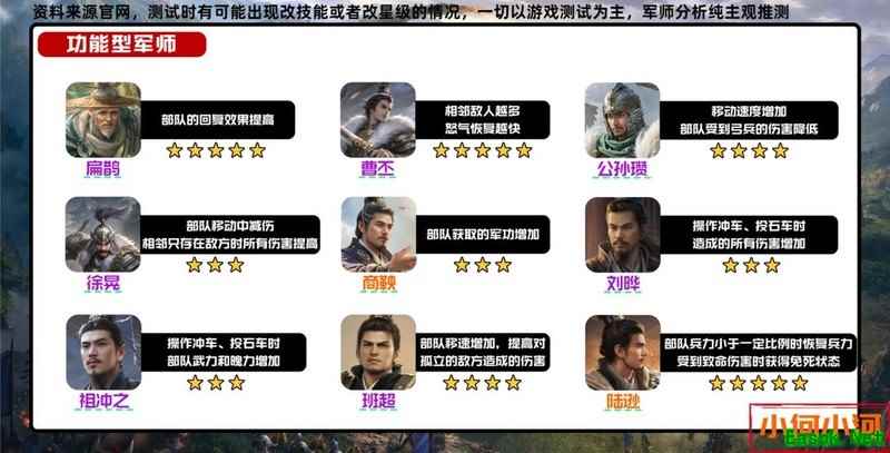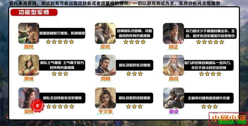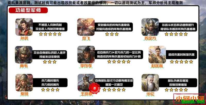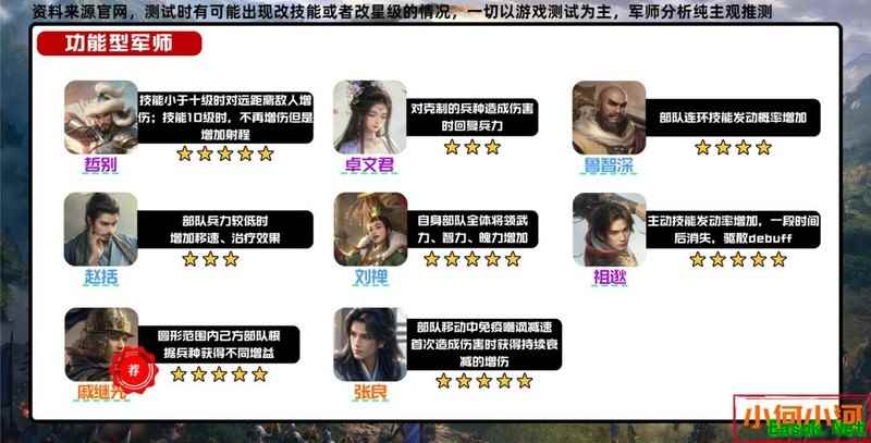 前面介绍了输出型和防御型军师,并给出了个人推荐和评分。接下来我们将介绍功能型军师,在此先做个引导: 新手必看!游戏攻略第一弹——兵种详解,助你轻松上手,快速掌握核心玩法。 游戏攻略第二期——资源建筑详解,助你快速掌握关键建造技巧。 游戏攻略第三篇——输出将领解析 - 王于兴师攻略讨论区 王于兴师游戏攻略第四篇——防御将领解析,尽在网络论坛。 王于兴师游戏攻略第五篇——辅助将领玩法解析,详见网络论坛。 游戏攻略第六期——内政将领详解,助你轻松上手王于兴师。 游戏攻略第七篇——攻击军师详解,详见网络王于兴师论坛综合讨论区。 游戏攻略第八期——防御军师玩法解析,助你轻松应对战斗挑战。 本次一图流为每位将领进行了主观推荐,满分为五星。因缺乏具体数值,只能根据技能介绍进行大致的主观评定。评分还结合了将领的星级情况,一些三四星将领虽然技能描述可能不如五星将领亮眼,但因获取难度较低等因素,最终评分可能会高于部分五星将领。 本文介绍功能型军师,首先提供使用指南。 可以看到,功能性军师数量众多,其中几位在介绍中显得尤为重要:王彦章、貂蝉与戚继光。王彦章是连环队特别是双核队伍的关键人物,其能力可使部队额外进行一次普通攻击,从而大幅提升连环伤害的触发机会。貂蝉的作用则体现在提升队伍主动技能发动概率上,效果直接有效。至于戚继光,他能为其他部队提供增益效果,在前期资源有限的情况下尤为实用,可以有效强化主力队伍的整体表现。 王于兴师预下载,6.7版本SLG战争策略即将上线。 |
