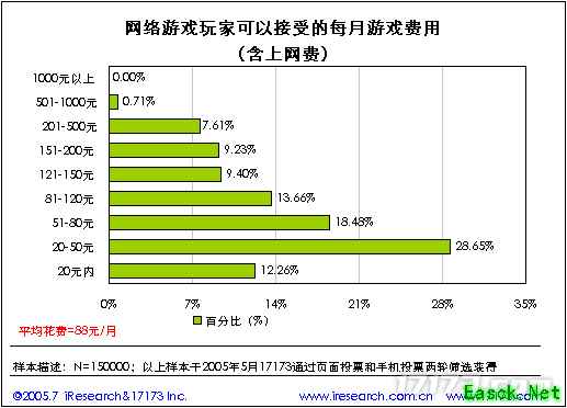 3.2. 网络游戏玩家愿意支付的最高游戏费用(含上网费) 网络游戏玩家可以接受的每月游戏费用远低与目前每月实际消费的费用,网络游戏玩家可以接受的每月游戏费用为88元,其中,心理价位在20-50元的用户比例最高,占28.65%。