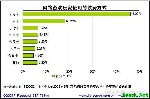 3.3. 网络游戏玩家喜欢的收费方式 网络游戏玩家最喜欢的收费方式仍然是包月卡,其次是点卡,其比例分别为46.29%和18.25%。