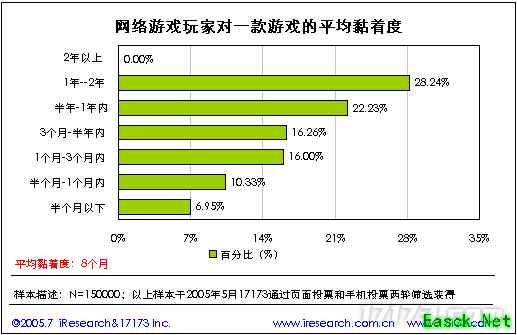1.6. 网络游戏玩家对游戏的黏着度 网络游戏玩家对某款游戏的平均黏着度为8个月,有2年以上长时间黏着度的网络游戏玩家为0,并且只有1个月以下黏着度的玩家占17.28%。