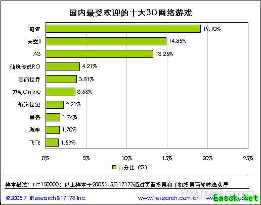 4.2. 国内最受欢迎的十大3D网络游戏 国内最受欢迎的3D网络游戏是奇迹,另外进入前三甲的网络游戏是天堂II和A3。