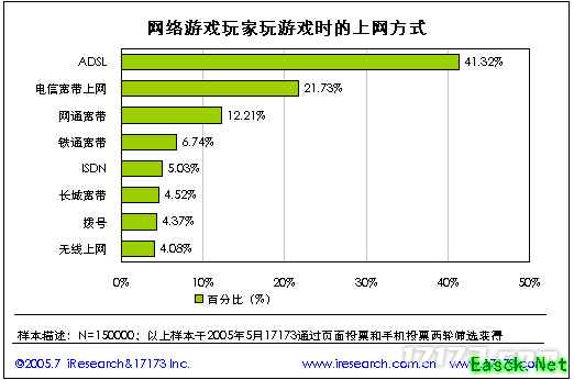 1.11. 网络游戏玩家玩游戏时的上网方式 网络游戏玩家玩游戏的主要上网方式是ADSL,占41.32%,比上一届的调研数据下降了12.43%,其次是电信宽带和网通宽带,分别占21.73%和12.21%,与上一届调研比率有所上升。