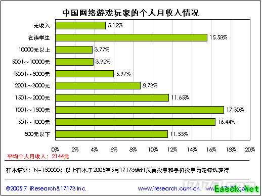 5.网络游戏玩家的基本属性分析 5.1. 中国大陆网络游戏玩家个人月收入分析 国内网络游戏玩家中,在读学生占15.88%,无收入玩家占5.12%,其余79.3%的有收入玩家的平均个人月收入为2144元。