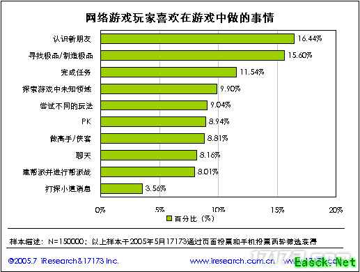 2.2. 网络游戏玩家在游戏中喜欢做的事情 网络游戏玩家最喜欢在游戏中做的事情是认识新朋友,其次是寻找极品和制造极品,其比率分别为16.44%和15.6%。
