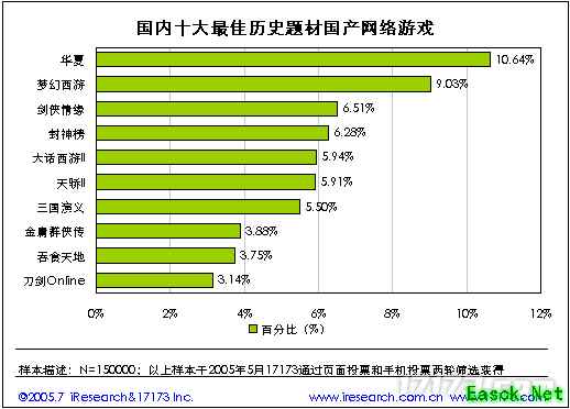 4.8. 国内十大最佳历史题材国产网络游戏 华夏以10.64%的比例被选为国内最佳历史题材的国产网络游戏,进入十大最佳历史题材国产网络游戏的还有梦幻西游和剑侠情缘,其比例分别为9.03%和6.51%。