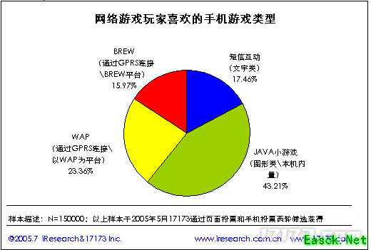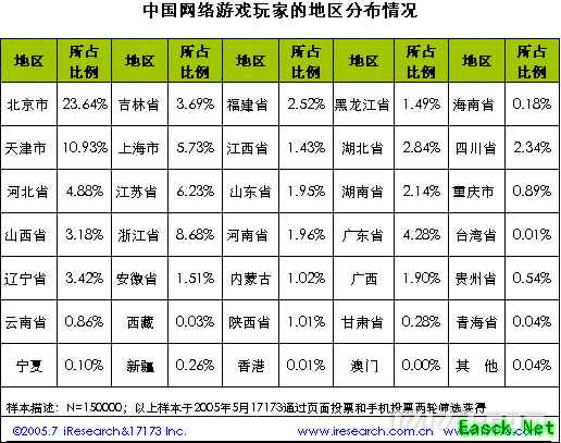 本次调查由17173.Com独家主办,上海艾瑞市场咨询、骏网集团协办,综合了前四届市场调查的经验,是历届中规模最大,内容最全的一次。我们在线上调查的基础上,同时派出记者进行线下调查,进行手机游戏、研发力量、代理运营三方面的深入调查。从而能更全面和系统的得出当前中国网络游戏市场的现状。 本次调查的线上部分和手机短信部分共收集到有效问卷15万多份,涵盖三大类三十四个小项: 1.中国网络游戏市场的状况 中国大陆网络游戏玩家分布情况 中国大陆网络游戏市场占有排名情况 国产游戏和国外游戏比例 中国大陆网络游戏中3D和2D玩家的比例 中国大陆玩家对各网络游戏类型的喜爱程度 中国大陆网络游戏画面内容受欢迎程度 中国大陆网络游戏音乐、音效内容受欢迎程度 中国大陆网络游戏运营商客户服务状况 中国大陆网络游戏玩家对外挂的态度 玩家喜爱的国产游戏分布 中国大陆玩家网络期待度分析 2.网络游戏玩家的群体分析 中国大陆网络游戏玩家上网方式分析 中国大陆网络游戏玩家上网频率、时间长度、周期 中国大陆网络游戏玩家上网地点 中国大陆网络游戏玩家在网络游戏上现实消费和心理价位和费用来源 中国大陆网络游戏玩家玩游戏目的、对游戏中关注的现象以及对代练现象的态度 中国大陆网络游戏玩家购买点卡地点、种类、收费方式 中国大陆网络游戏玩家喜欢什么样的游戏(包括种类、风格、声音、画面等) 中国大陆网络游戏玩家离开一款网络游戏或者不玩一款网络游戏的原因 中国大陆网络游戏玩家对服务器选择的分析 中国大陆网络游戏玩家在游戏中经常做的、喜欢做的事情和最想得到什么帮助 中国大陆网络游戏玩家可能消费的网络游戏产品和经常购买的游戏杂志 中国大陆网络游戏玩家了解网络游戏途径 中国大陆网络游戏玩家RMB交易情况调查 中国大陆网络游戏玩家喜欢的手机游戏类型 3.网络游戏玩家的基本属性分析 中国大陆网络游戏玩家收入分析 中国大陆网络游戏玩家性别分析 中国大陆网络游戏玩家地域分布分析 中国大陆网络游戏玩家年龄情况 中国大陆网络游戏玩家婚姻情况 中国大陆网络游戏玩家网龄情况 中国大陆网络游戏玩家职业分布 中国大陆网络游戏玩家的其他分析 现将其中“17173第五届中国网络游戏市场调查报告(简版)”公布,仅供大家参考! 具体内容如下: 调查背景 2005年1月19日发布的中国互联网络信息中心(CNNIC)“第十五次中国互联网络发展状况统计报告”显示,我国上网用户总数为9400万,比半年前增长8%,使用宽带上网的人数达到4280万;上网计算机达到4160万台,比半年前增长了14.6%。本次CNNIC调查指出, 15.9%的用户选择网络游戏为经常使用的上网娱乐方式。