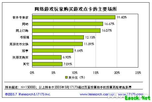 1.7. 网络游戏玩家购买游戏点卡的主要地点 软件专卖店是网络游戏玩家购买游戏点卡的主要场所,其使用比率为19.6%,其次是网吧和网上订购,分别为16.67%和16.07%。
