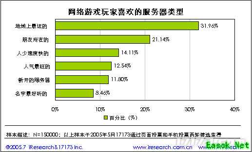 2.3. 网络游戏玩家喜欢的服务器情况 网络游戏玩家最喜欢选择离所处地方最近的服务器,其次是选择朋友所在的服务器,其比率分别为31.96%和21.14%,与上一届的调研数据正相反。