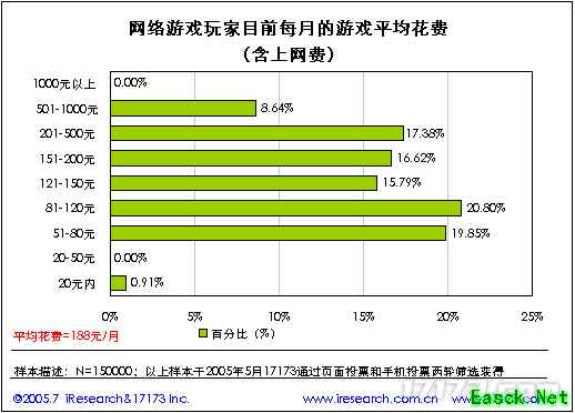 3.中国网络游戏玩家的消费行为分析 3.1. 网络游戏玩家当前每月的平均游戏费用(含上网费) 目前,网络游戏玩家每月的平均游戏费用(含上网费)为188元,其中,每月平均花费在81-120元的网络游戏玩家比率相对比较高。