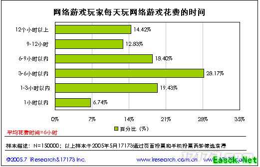 1.4. 网络游戏玩家花费在游戏中的时间 网络游戏玩家每天玩游戏所花费的平均时间为6小时,其中,每天花费3-6小时玩游戏的网络游戏玩家占28.17%。在花费的整体平均数上与上一届的调研分析数据没有差异。