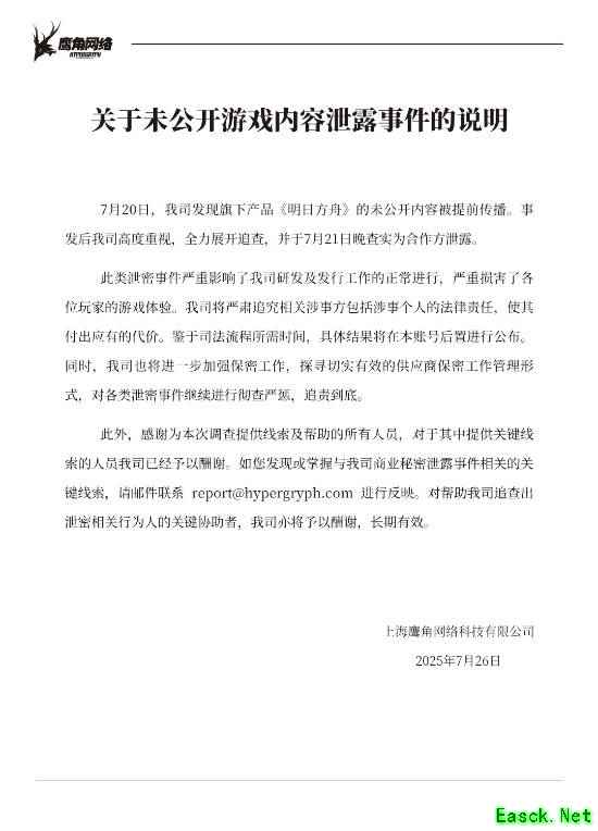 7月26日,鹰角网络在B站发布了一篇声明,称旗下游戏《明日方舟》的未公开内容被提前传播,查实为合作方泄露,并表示将严肃追究相关涉事方包括涉事个人的法律责任,一起来看下完整声明。 声明如下: 关于未公开游戏内容泄露事件的说明 7月20日,我司发现旗下产品《明日方舟》的未公开内容被提前传播。事发后我司高度重视,全力展开追查,并于7月21日晚查实为合作方泄露。 此类泄密事件严重影响了我司研发及发行工作的正常进行,严重损害了各位玩家的游戏体验。我司将严肃追究相关涉事方包括涉事个人的法律责任,使其付出应有的代价。鉴于司法流程所需时间,具体结果将在本账号后置进行公布。同时,我司也将进一步加强保密工作,探寻切实有效的供应商保密工作管理形式,对各类泄密事件继续进行彻查严惩,追责到底。 此外,感谢为本次调查提供线索及帮助的所有人员,对于其中提供关键线索的人员我司已经予以酬谢。如您发现或掌握与我司商业秘密泄露事件相关的关键线索,请邮件联系 report@hypergryph.com 进行反映。对帮助我司追查出泄密相关行为人的关键协助者,我司亦将予以酬谢,长期有效。 上海鹰角网络科技有限公司 2025年7月26日 本文由制作发布,未经允许禁止转载。 更多相关资讯请关注:明日方舟专区 |