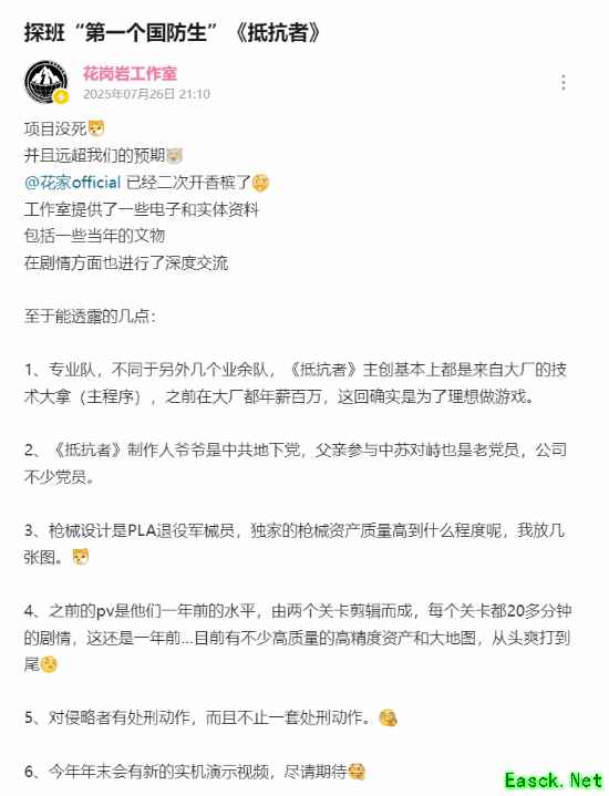 自去年9月浩汤科技公布了以1940年代中国为背景的战争题材FPS游戏《抵抗者》(The Defiant)的实机预告后,该项目一度沉寂。 官方透露,去年发布的预告片仅代表了团队一年前的水平,由两个时长超过20分钟的关卡剪辑而成。目前,游戏已拥有大量高质量、高精度的资产和大地图,将为玩家带来“从头爽打到尾”的体验。 游戏将包含针对侵略者的处决动作,且不止一套,增强了玩家的代入感和复仇快感。 “花岗岩工作室”最后表示,一款全新的实机演示视频将在今年年末发布,敬请玩家期待。 本文由制作发布,未经允许禁止转载。 更多相关资讯请关注:抵抗者专区 |