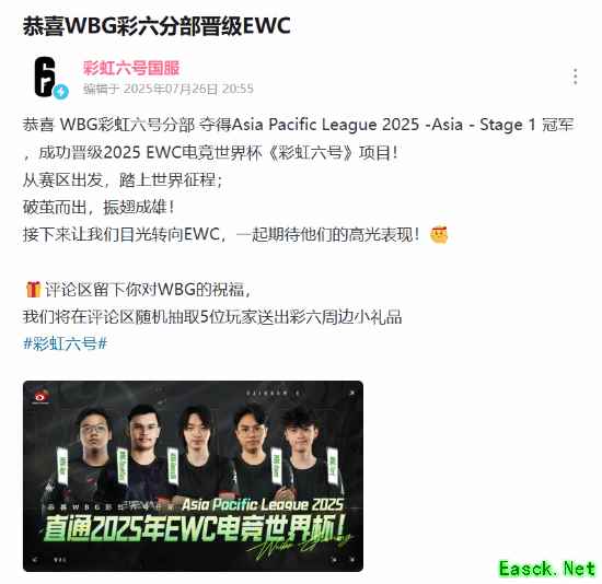 中国选手Reeps96所在的WBG彩虹六号分部在Asia Pacific League 2025 Asia Stage1当中斩获冠军,成功晋级2025 EWC电竞世界杯《彩虹六号》项目!《彩虹六号》国服官方发文庆祝。