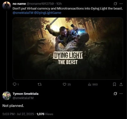 《消逝的光芒2》曾获得玩家普遍好评。然而当Techland推出包含"DL点数"(需用真钱购买的游戏货币)更新后,该作评价明显下滑。“付费变强”让许多人感到不公平。 ![]() Techland新作《消逝的光芒:困兽》旨在回归本源,第一步就是避免添加虚拟货币,总监Tymon Smekta?a已确认了这点。他表示《困兽》将没有任何额外付费内容,没有虚拟货币和微交易。 ![]() 最近玩家noname1012750向总监Tymon Smekta?a发问:“请不要在《消逝的光芒:困兽》中加入虚拟货币和微交易”,Smekta?a回复称:“没有计划”。尽管这不能排除未来可能出现某种商业化方案,但至少确认游戏首发时不包含任何额外付费内容。 此前Techland将《消逝的光芒:困兽》发售日推迟至9月19日,就是为了更好优化玩法、用户界面、物理效果、动画及过场演出。 |