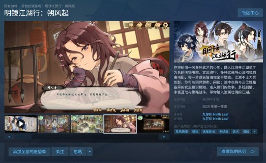 武侠模拟养成RPG《明镜江湖行:朔风起》Steam页面上线,定于2026年第一季度发售。本作由国内独立游戏工作室九芽川开发和发行。 你将扮演一名身怀武艺的少年,踏入以培养江湖英才为名的明镜书院。文武修行、多种武器与心法招式自由搭配,每一步成长皆由你亲手塑造。江湖不止刀光剑影,你可与同伴游市、闲谈;途中也将与三位性格各异的女主相识相知,走入她们的故事。多线剧情、丰富互动与策略战斗,带你踏入波澜壮阔的江湖。 ![]() 游戏介绍 本作中你将扮演一位身怀武艺的少年,因一场意外踏入以培养江湖英才为名的明镜书院。但这里不仅是修行文武之地,更是各方势力的交汇点。 朝堂权谋、江湖纷争、旧教余孽……风云诡谲,正邪难辨。在平静与动荡交织的书院生活中,你将结识形形色色的江湖人物,追寻尘封旧事的真相。 沉浸式剧情体验与丰富角色互动、自由武侠养成、独特招式心法系统,带你踏入一个鲜活而波澜壮阔的江湖! 游戏特色 自在修行 校场练武,大展身手。讲堂修文,金榜题名。多达十二项养成维度,体验文修武炼并重的学院生活,塑造属于你的侠客。更有种植草药,烹饪菜肴,烧烤,打猎,下棋,悬赏任务等多种玩法! 海量剧情 超50万字原创剧情,30+原创CG! 搭配大量支线任务与额外CG,打造沉浸式江湖体验!“杏林圣手”,“百艺皆通”,“逍遥游”,“天下归心“...20+结局等你解锁! 战斗构筑 经典回合制战斗融入独特【招式阶段】与【招式走向】系统。超100+招式心法组合,打造你的专属武学流派!掌控节奏,步步为营,打出一气呵成的连招! 闯荡江湖 八位性情各异的江湖人物等你结识,包括三位可攻略角色和两位可选择入队角色。每位角色皆配有专属Q版人物,或于繁华街巷相遇,或在小馆茶摊促膝长谈。随着关系加深,每位角色都将解锁专属好感剧情与独占CG! 关于九芽川工作室 九芽川工作室是由4名热爱游戏开发的小伙伴共同创立的独立游戏工作室。 作为我们工作室的第一作,《明镜江湖行:朔风起》承载了我们的独立游戏梦,也是我们共同努力的成果。 自立项之初,我们对其进行了多次调整与打磨,力求给玩家创造沉浸体验。 希望大家都能享受《明镜江湖行:朔风起》,享受这一段江湖路。 制作人/程序/文案:水獭 程序:马师傅 策划:Mr.大猩猩 美术:凌汪汪 ![]() ![]() ![]() ![]() ![]() ![]()