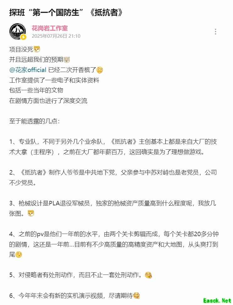 去年9月国产抗日FPS《抵抗者》(The Defiant)预告后,之后便无新消息公布。近日B站UP主“花岗岩工作室”透露了该作新进展,其开发进度远超预期,今年年末会有新的实机演示公布。 “花岗岩工作室”称与《抵抗者》开发商浩汤科技进行了深度交流:主创团队成员大多来自国内一线大厂,曾是“年薪百万”的技术专家,此次投身游戏开发是出于对理想的追求。 《抵抗者》枪械设计由一位退役的解放军军械员负责的。因此,游戏中的枪械资产质量极高且独家,力求还原最真实的武器细节。 官方透露去年的预告仅代表了团队一年前的水平,由两个时长超过20分钟的关卡剪辑而成。目前游戏已拥有大量高质量、高精度资产和大地图,将为玩家带来从头爽打到尾的体验。游戏将包含针对侵略者的处决动作,且不止一套,增强了玩家的代入感和复仇快感。 |