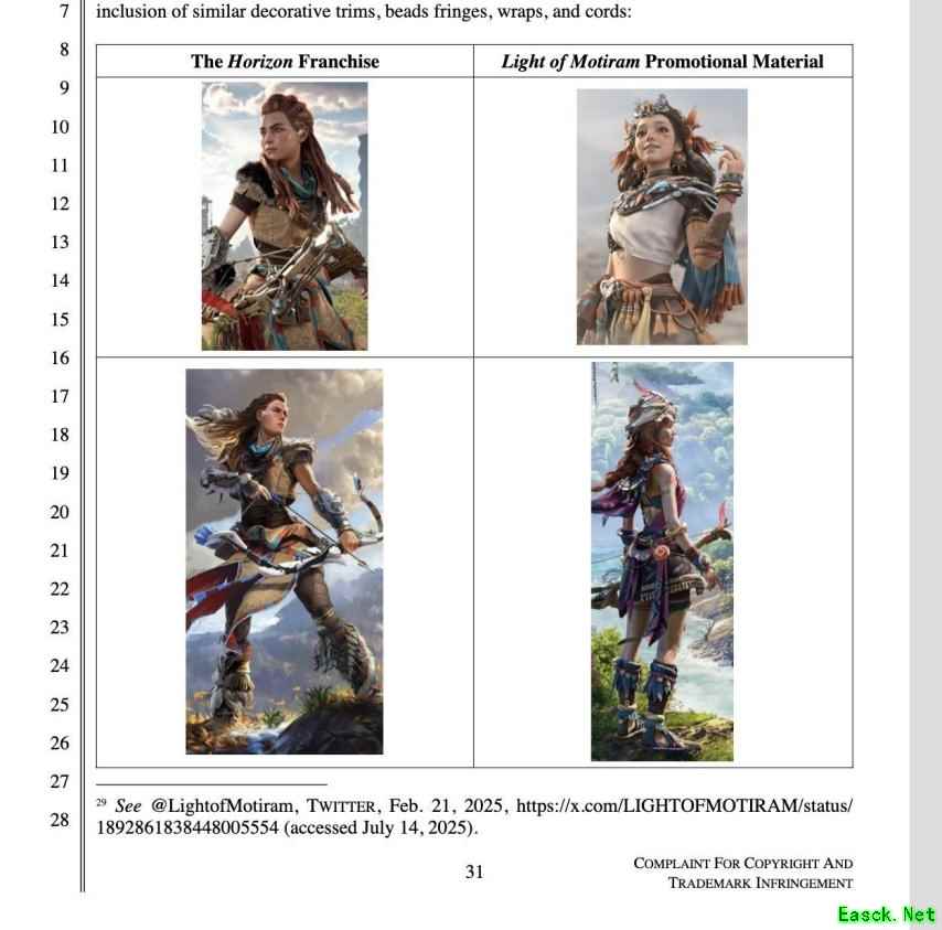 索尼指控腾讯新游《荒野起源》涉嫌抄袭《地平线:零之曙光》,称《荒野起源》是《地平线》的“照搬克隆版”。 索尼表示,在去年拒绝了腾讯提出合作开发《地平线》新作的提议后,腾讯随即宣布推出机械文明荒野生存游戏《荒野起源》,索尼认为该游戏的玩法、故事主题和艺术元素与《地平线》完全相同,且有许多其他相似之处。 比如,角色身上有着相似的装饰点缀,像是围巾、流苏等。