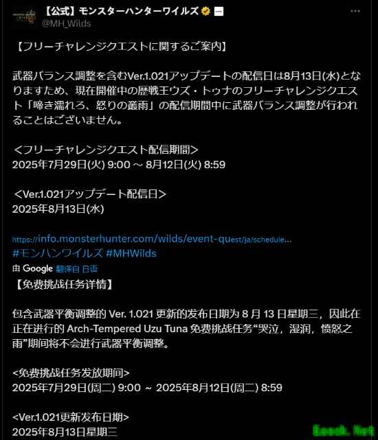 《怪物猎人:荒野》限时季节活动“交流祭典【踊火之仪】”已于7月23日正式开启,活动期间玩家可以通过每日登录和完成特定任务来收集票券制作装备,并推出了多种限定活动任务。 今日,《怪猎荒野》官方发文表示,此前承诺的武器平衡调整更新将包含在8月13日上线的Ver. 1.021补丁中,因此在正在进行的历战王波衣龙自由挑战任务“悲鸣濡身,怒雨倾盆”中将不会进行武器平衡调整,还请玩家们注意。 此外官方还宣布,由于Ver.1.021更新的发布日期定于8月13日,因此本次“交流祭典【踊火之仪】”的截止时间将从原本的8月6日推迟至8月13日,也就是新补丁推出后才会结束。 本文由制作发布,未经允许禁止转载。 更多相关资讯请关注:怪物猎人:荒野专区 |