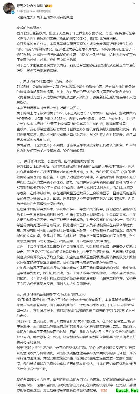 近日,网易游戏旗下的《世界之外》因定价问题引发了广大玩家的关注与讨论。昨日,《世界之外》官方微博在短时间内连续发布多条微博,针对近期的一系列争议事件作出回应。 以下按照时间顺序,详细梳理其官方微博声明内容。 一、7月29日23:25的致歉与解释 其中,针对网络上讨论较多的“365天不上线销号”“分享发布二创内容、游戏截图销号”等条例,官方特别强调,这些条例的更新时间均为2022年,近期没有任何改动和更新。 二、7月29日17:22的运营承诺 在7月29日17:22,官方发布微博称,会一如既往地好好运营《世界之外》,同时表示“被夸了就高高兴兴地做,被骂了也坚守本心。” 三、7月29日17:21的盈利说明 而在7月29日17:21,官方在微博中直言不讳地表示,《世界之外》也想赚钱 更多相关资讯请关注:世界之外专区 |