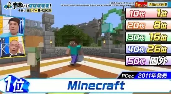 日本最大的电视广播机构近日公布了一项针对国民游戏喜好的大型调查结果。通过7月27日播出的特别节目,该台不仅发布了基于调查数据统计的国民游戏TOP100榜单,更揭示了不同世代玩家的趣味差异。 尽管榜单大部分被本土作品占据,但荣登榜首的却是微软旗下Mojang工作室2011年推出的沙盒游戏《我的世界》。调查显示本作在10代(10-19岁)玩家群体中支持率尤为突出,同样位列该年龄段榜单首位。 >