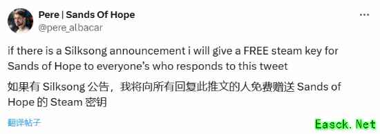 就在任天堂第三方合作伙伴直面会即将于今晚召开之际,一位独立游戏开发者派尔·阿尔巴卡尔(Pere Albacar)可能将面临送出数万份Steam游戏激活码的巨大挑战。 他此前曾承诺,如果《空洞骑士:丝之歌》(Hollow Knight: Silksong)在本次直面会上公布消息,他将免费赠送自己即将发布的游戏《希望之沙》(Sands of Hope)的Steam激活码给所有转发他推文的用户。 >
