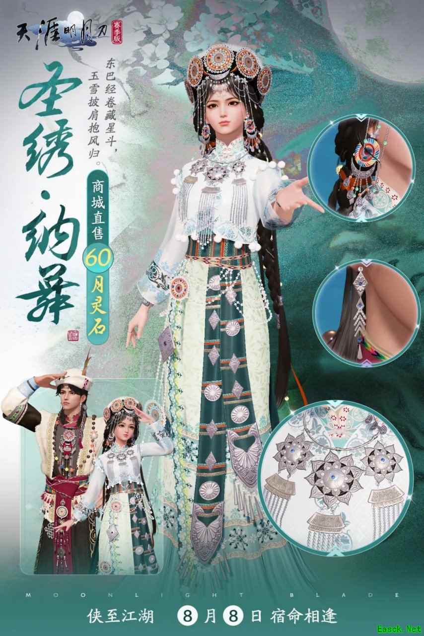 最新消息 [全新时装-圣绣·纳舞]上架时间:8月8日(S3赛季)外观售价:60月灵石上架商城外观说明:几个月前天衣阁小分队去巴马采风,制成的【心王·瑶姿】广受好评。为传承国风美学,近日苏阁主等人从风物志中了解到纳西族的故事。绣娘们灵感爆发,将东巴之美织成了S3赛季的绝美华裳【圣绣·纳舞】。收藏外观同步解锁耳饰【听情·纳舞】。