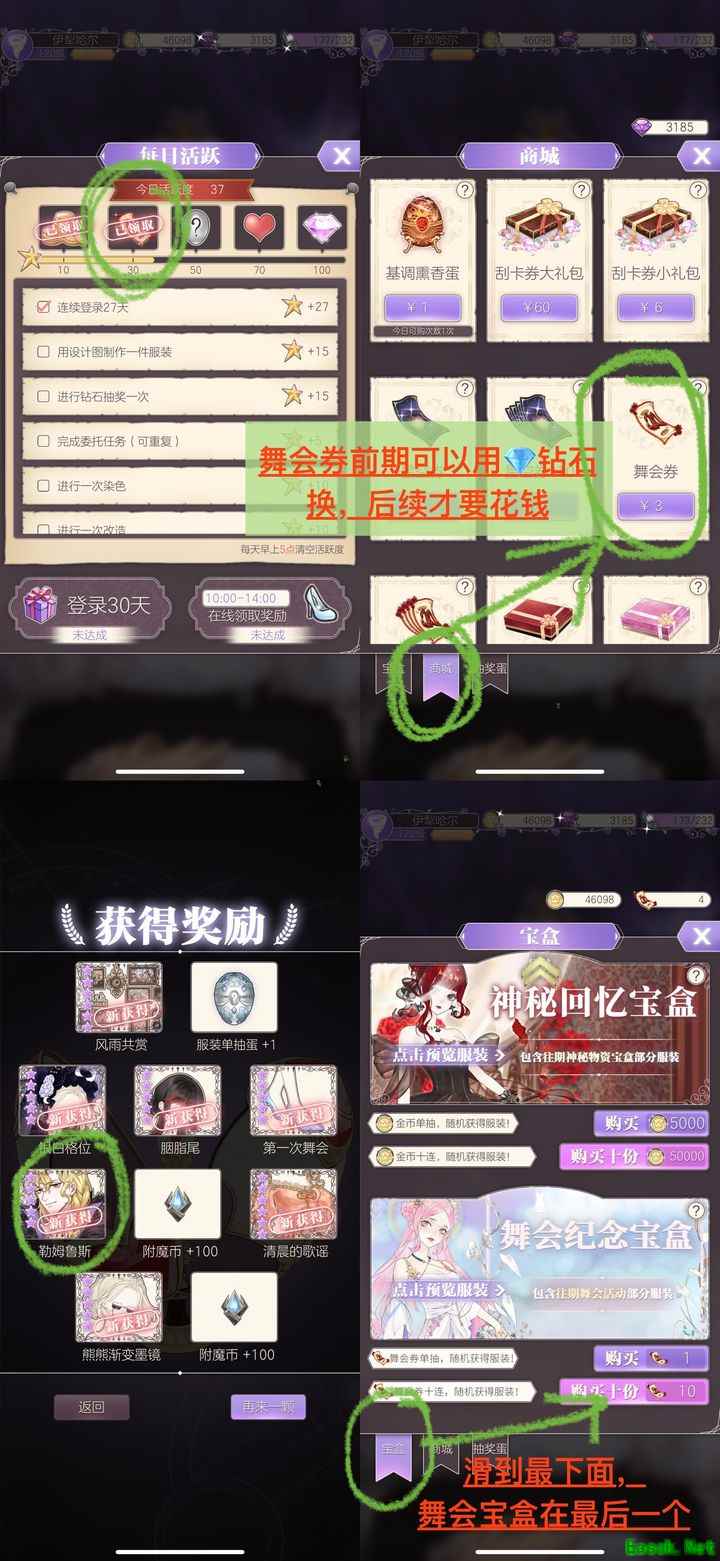 螺旋圆舞曲新手经验分享,从零开始不迷茫!本帖聚焦舞伴系统,详解获取方式与实用技巧,助你轻松搭配、高效养成,快速融入这场华丽舞会! 迷茫树上结迷茫果 迷茫树下你我同行 急得不知所措,四处寻找解决方法。 觉得游戏有趣但不太会玩(还是我) 快满级时才发现个人信息页有制作组的玩法说明,但已经用不上了。 小丑其实是我自己。 我决定整理一下自己浅显的游戏经验。 能为你效劳,真是太好了。 ————————分割线———————— 舞伴在哪儿?哪儿能找到舞伴?舞伴有什么作用? 舞伴的获取方法及使用技巧分享。 纯纯白嫖: 图一: 百货大楼每周营业额前1%员工可获得吉当舞伴奖励。 绿洲沙龙每周招待次数排名前1%的客人可获龙老板舞伴。 这两个别错过,刷新后努力争取还是能拿到的。 图二: 宝盒充能可兑换角色及部分系列皮肤。 48小时内免费累计30次后可获得1次兑换机会。 建议非必要服装部件先兑换舞伴。 图三: 每日活跃可免费领取舞会券,参与抽奖活动。 舞伴随机出现,可抽可不抽,看你手气如何。建议新手期攒十连抽,概率更高,轻松获得漂亮服饰。 图四: 人物好感度达到10级可解锁原皮舞伴,但需要投入大量时间。 图五: 满级后开启第二季剧情,继续完成任务获取奖励。 钻石购买: 图六: 1.戴咪的商店 戴咪507,妈妈540,克里斯蒂1350,周鹤歧1620。 闪耀宝盒充能加速,免费获取来不及的话(参考图二)。 累计抽卡三十次,即可用千钻十连免费兑换一次。 舞会门票(见图三) 商城钻石购买(限购数量已忘,后续价格3元一张,不建议购买) 通过努力积累资源,基本可获得各个人物舞伴;若仍有不足,也可前往商城购买舞伴礼盒来补充。