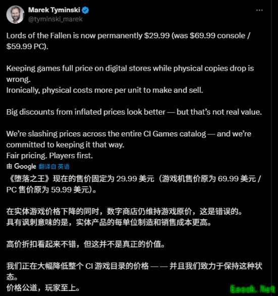 《堕落之主》开发商CI Games的CEO Marek Tyminski宣布,《堕落之主》的售价将固定为29.99美元。而之前主机版原价为69.99美元,PC版原价为59.99美元(人民币298元)。 目前价格已经更新,不过由于各个区服未同步调整,让玩家们以为本作环国区降价。不过随后,国区价格也由298元永降至199元。 Marek Tyminski表示,当实体版游戏降价时,数字版商店仍维持全价的做法是错误的。讽刺的是,实体版每份的制造和销售成本其实更高,“虚高的定价使得哪怕拥有再大力度的折扣,也并非游戏的真实价值。” 此外Marek Tyminski还补充称,目前正在全面下调CI Games旗下所有游戏的价格,并将持续保持这一策略。“价格公道,玩家至上!” 本文由制作发布,未经允许禁止转载。 更多相关资讯请关注:堕落之主专区 |