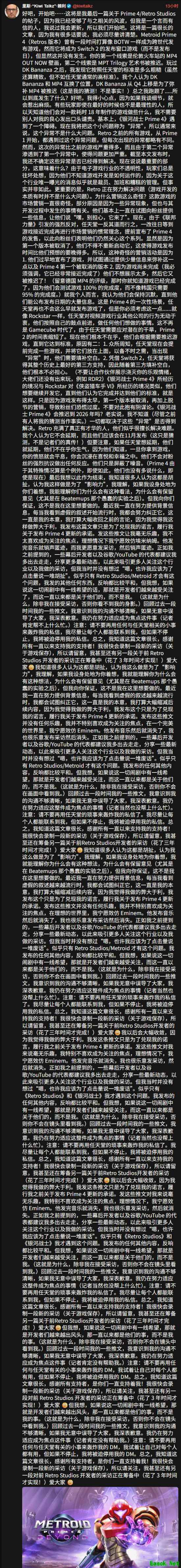 他写道:“可以说,《银河战士Prime 4》遇到了一些‘卡壳’。我称之为‘异常’(Anomaly)……Retro此前从《Prime 1》起的每款游戏都经历过类似问题,但这次的‘异常’更为严重,并且还叠加了第二个问题,导致情况更加复杂。” 尽管他没有提供具体技术细节,但他明确表示本次的问题要比Retro过去处理的困难多得多。他还补充说,目前并不确定这些问题是否已经解决。 KiwiTalkz 强调,这次的问题并不是由于加班压榨、裁员或管理混乱所致,而是游戏开发过程中常见的复杂性挑战。他表示,尽管遇到了困难,但《银河战士Prime 4》“已经非常接近完成”,只是任天堂在一切彻底敲定前不愿提前公布过多信息,营销活动已经停止。