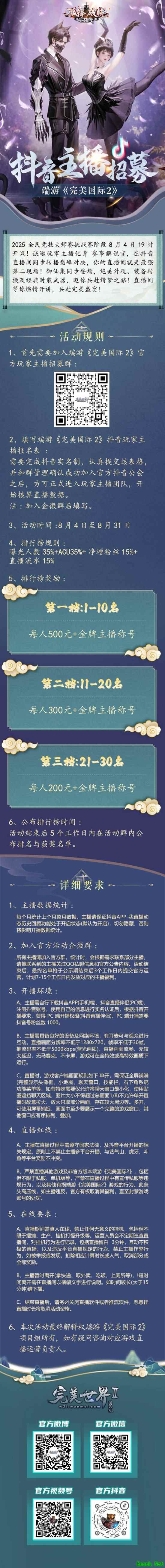 【抖音、视频号双平台直播】 《完美国际2》官方抖音、视频号直播间,是你感受血脉贲张的绝佳阵地。赛事解说天团已严阵以待,他们将用犀利的洞察、激情的呐喊,为你深度剖析战局走向,放大每一波惊心动魄的团战操作,点燃你灵魂深处的竞技之魂!锁定直播,与修行者们同频共振,不错过任何一秒的巅峰对决。 【七大品牌鼎立加持】 WD_BLACK电竞固态硬盘、京东电竞、宾果耳机、andaseaT安德斯特电竞椅、三星玄龙骑士电竞显示器、阿华田、纳宝帝七大品牌倾情加盟,成为2025全民竞技大师赛官方合作伙伴。他们不仅为赛事提供强力支持,更将带来多重惊喜福利与专属豪礼,助力每一位修行者在竞技赛场上势如破竹!