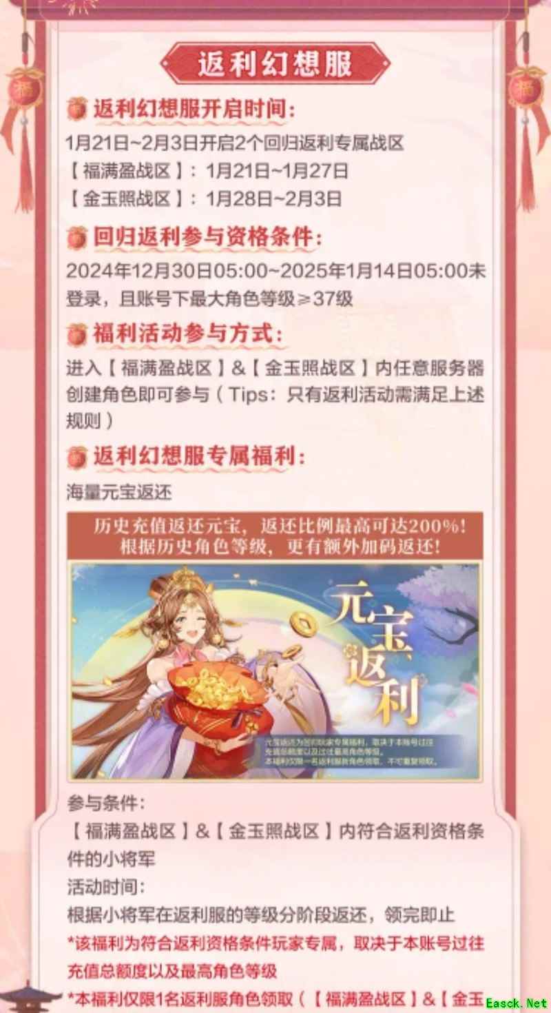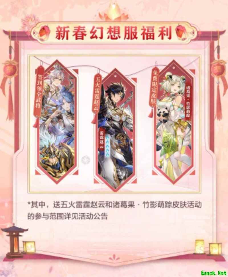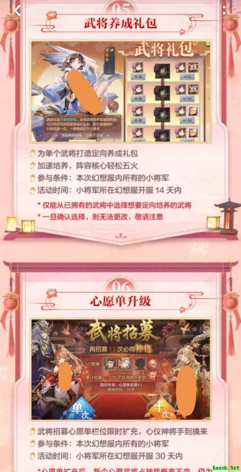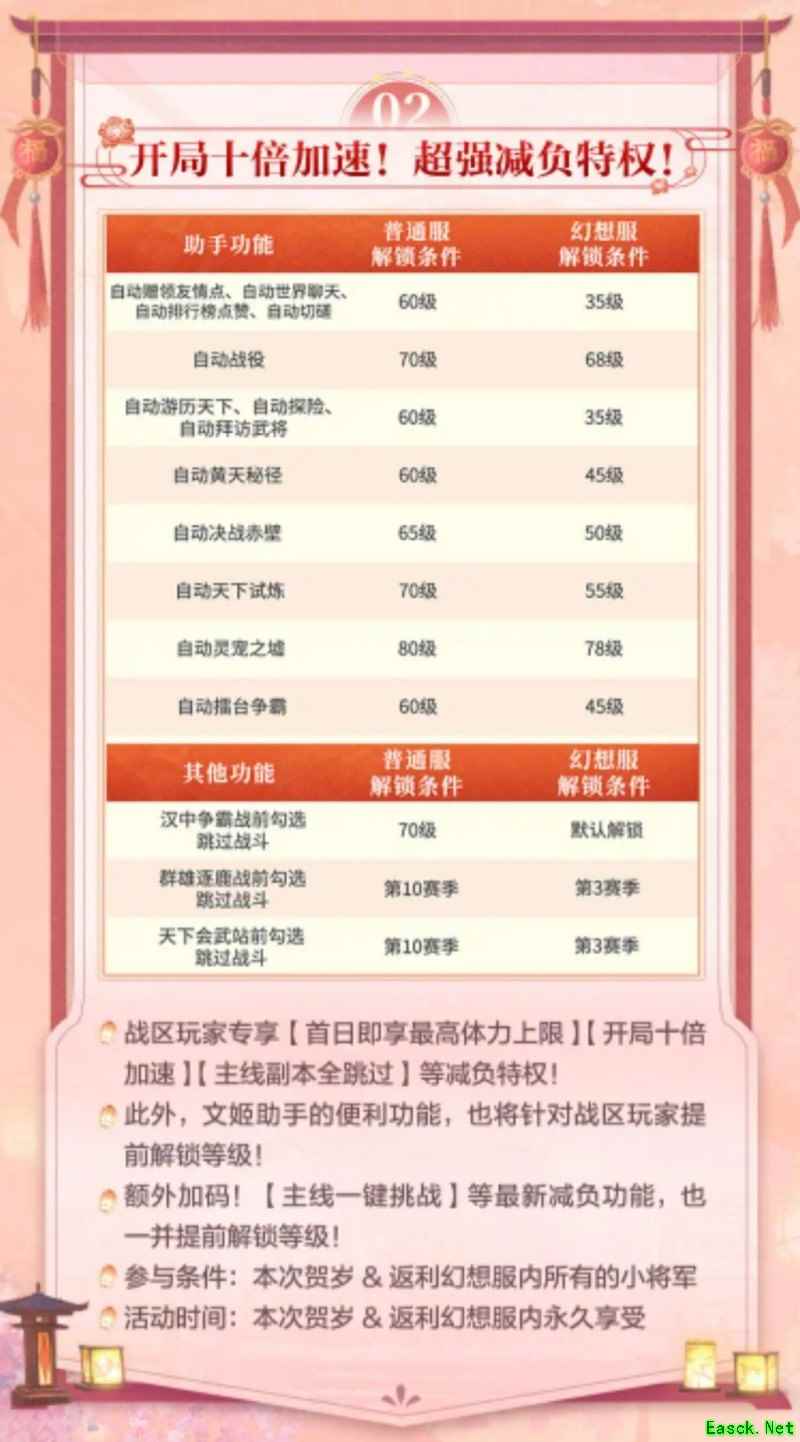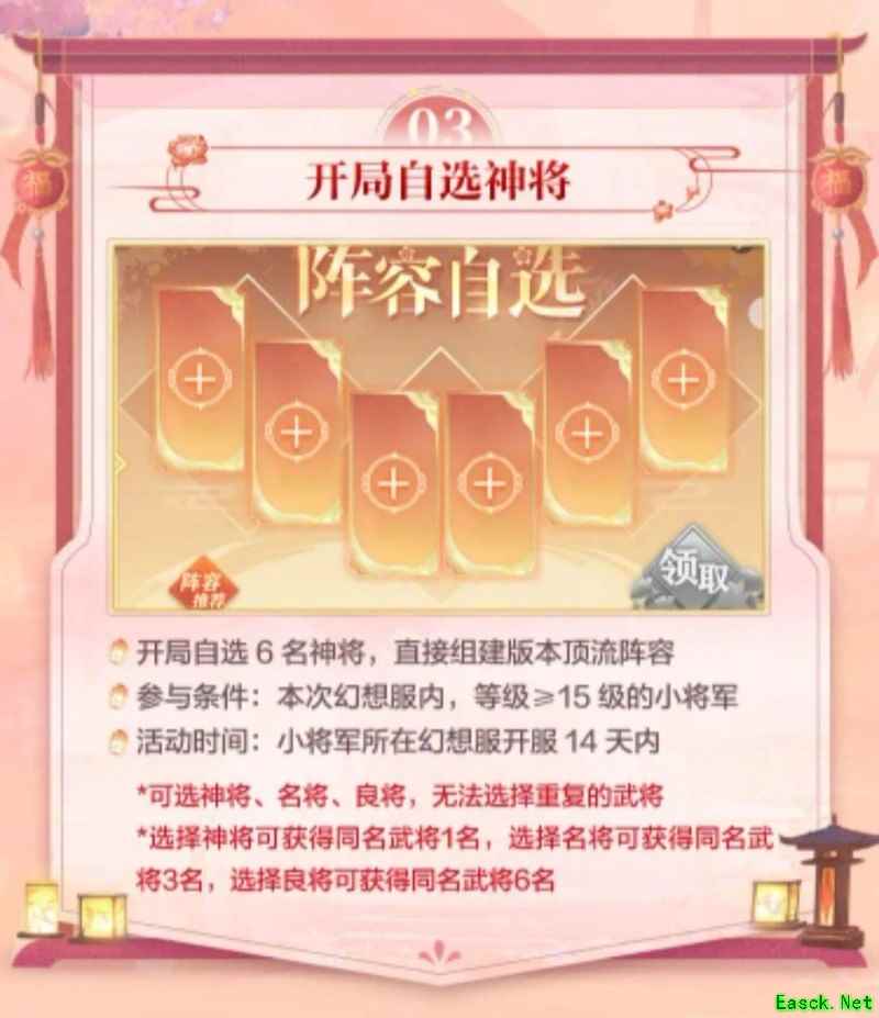 三国志幻想大陆新春幻想服即将开启!1月21日开服,预约即领豪礼,七天登录送全武将、自选神将、大小月卡免费领,还有等级加速、养成礼包等多重福利,助你开局称霸! 新春新服开启时间 1月21日至2月3日为开服时段 1月14日起可预约,上线即享贺岁幻想服礼包。 新春开服送强力武将 担心开局难?七日签到送全武将,含赵云,更有诸葛果限时皮肤相赠,精彩不容错过。 免费送大小月卡,预约即领豪礼 新春幻想服即将上线,大小月卡免费赠送,限时半个月内领取,逾期无效。预约即享丰厚好礼,具体开服时间请留意官方通知,精彩不容错过。 返利服 充值返利,战区福利,豪礼相送,氪金即返 重点来了 重点来了 重点来了,重要事情说三遍。 开服送全民福利 登录七天送武将任选 登录七天送武将任选福利 开服首日签到即赠强力武将,后续几天可自选心仪武将,具体。所有活动均在开服半个月内有效,过期不再开放,请及时参与。 开局任选武将 第三大福利,开局即赠六大自选武将,助你轻松组建最强阵容,无需担心战力不足,助力主公迅速崛起,顺利实现称霸江湖的宏图伟业。 等级加速 开服即享等级加速,助力主公迅速提升战力,轻松争霸天下。 等级奖励 等级达标即享豪礼,海量奖励加赠精美武将皮肤,助你畅享游戏乐趣。 开服半年内的时间 武将培养与招募推荐 武将获得后如何培养提升战力 优先培养主C强力武将,切勿选错推荐礼包中的培养目标。 推荐自选武将抽取,轻松招募心仪武将,提升阵容实力。 活动期限不超过一个月 ............. ............. ............. 1.16最新武将阵容搭配推荐 蜀汉阵容搭配:关平、法正、姜维、马超、马良、水镜,搭配诸葛、关羽魂将,阵容均衡,攻守兼备,适合多种战斗场景。 火系阵容推荐:鲁肃、周瑜、孙鲁育、关平、陆抗、姜维组合搭配。 蔡文姬 近期将上线蔡文姬,因形象略显暴露故作调整,技能特效表现不俗,具体搭配尚不明确,欢迎玩家分享更多搭配思路。 |