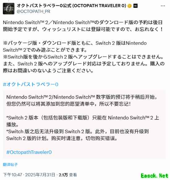 八方旅人0实体版NS2&PS5封面速览!NS2版为钥匙卡
