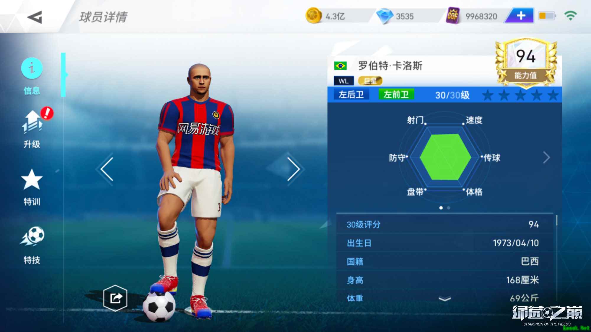 作为绿茵之巅的第一张【世界传奇】系列卡,罗伯特·卡洛斯拥有着傲视后卫群的94总评数值(30级),作为曾经的世界第一左后卫、其防守、体格,速度属性都极为优秀,足可以与任何边路快马进攻球员抗衡。