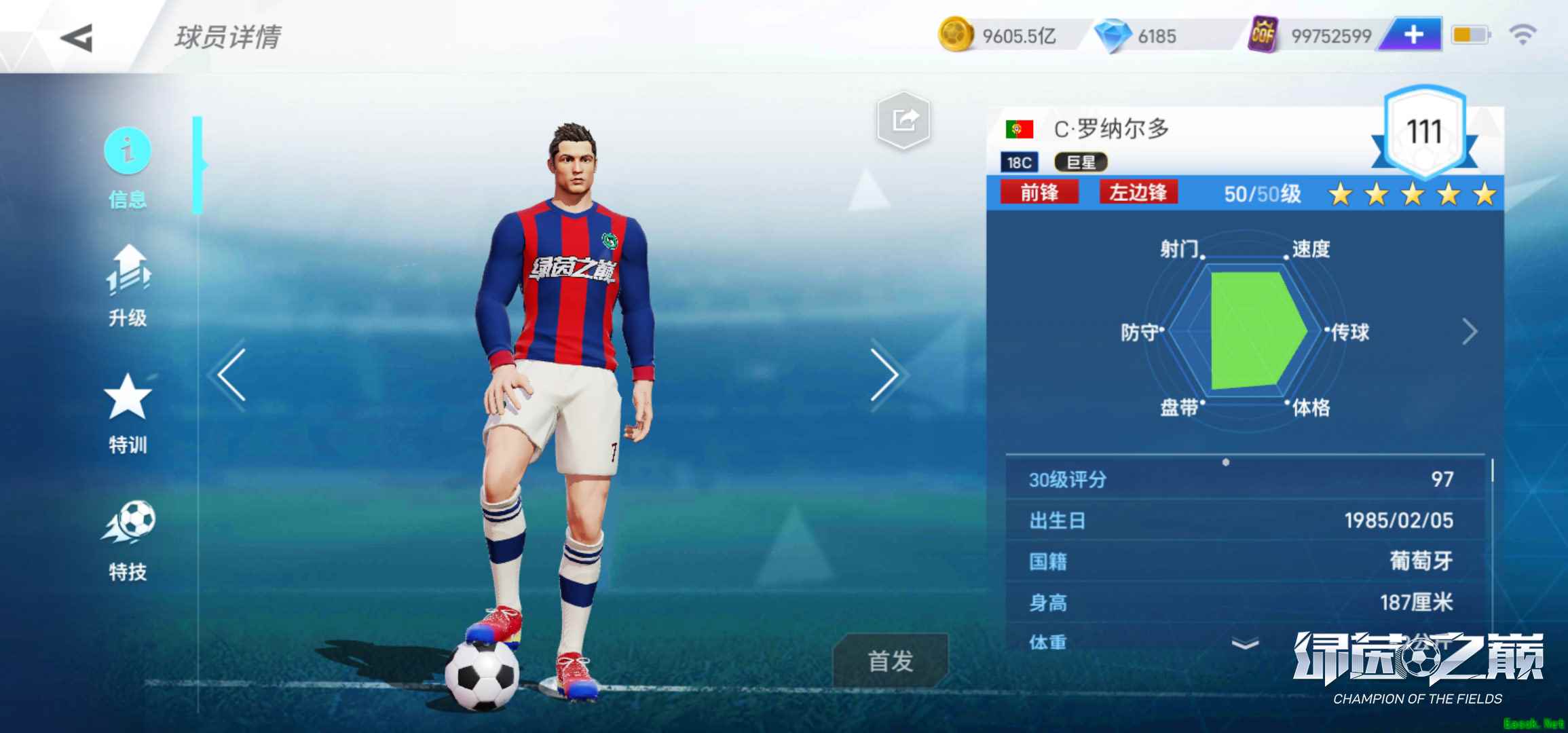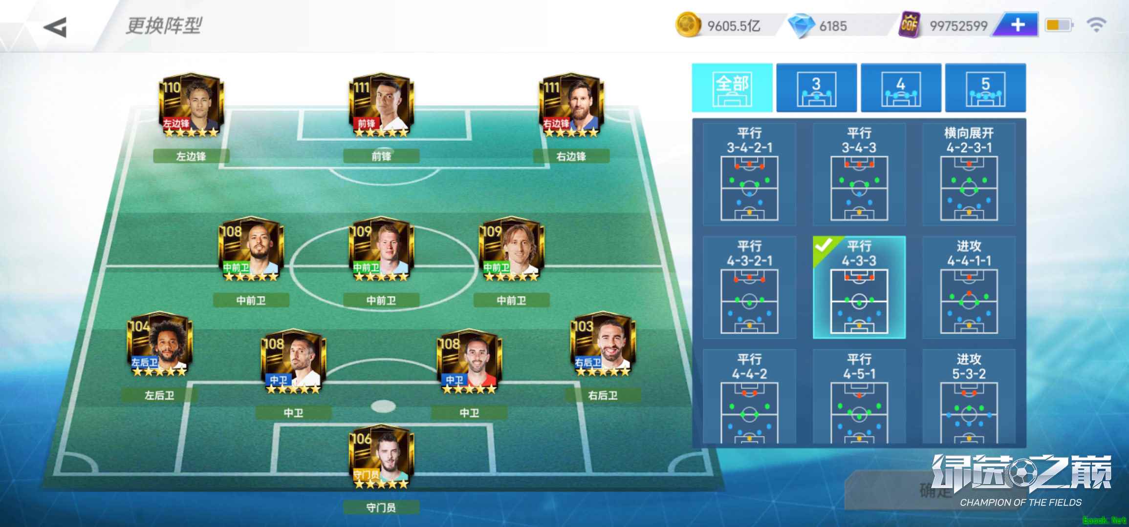 4-3-3阵型的缺点在于,首先,这一种为了加强边路进攻而采用的阵型,所以对中场三名前卫的能力要求比较高,既需要控球能力好,又要能够充当边锋突破传中,而且中场前卫和中后卫防守压力较大。其次,两个边前锋虽然进攻优势明显,但是防守时回撤距离长,对体力消耗较大。 4-3-3阵型较为灵活,因此4-3-3阵型的变阵也很多。游戏内还有另一个知名度较高4-3-3伪九号阵型,阵型的精髓在于通过“伪九号”球员出色的传控与进攻能力,给到对方中后卫足够的压力,从而创造更多进攻机会。巴萨“梦三”时期主打的便是4-3-3伪九号阵型,而梅西便是那个“伪九号”。无论如何变阵,对于4-3-3阵型来说,成功的关键还是在于球队能否以攻代守,掩盖防守短板。 对位调整,阵型效果最大化 4-3-3阵型的优点,是既能用进攻牵制对方,又能再局部形成人数上的优势,因此对球员的能力要求也很高。首先,需要一名能力全面的前锋,要具备一般前锋不可企及的单打独斗的能力,可以拿球、做球、抢点攻门,如果你拥有稀有球员,推荐使用C罗、阿圭罗、本泽马、苏亚雷斯等球员,如果你资金有限,可以使用迭戈科斯塔。