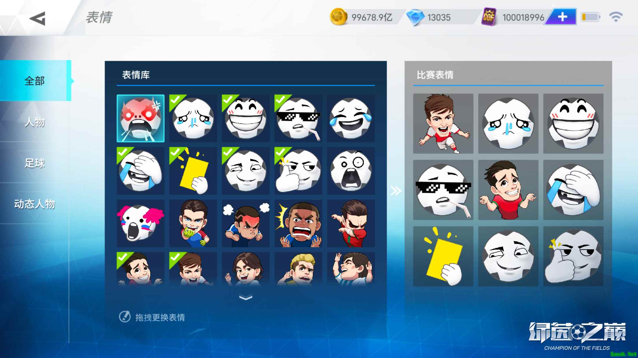 多种表情 比赛互动两不误 《绿茵之巅》从玩家的角度出发,在紧张激烈的比赛中,玩家们很难抽出空隙与对手聊天互动,但《绿茵之巅》的表情系统,为广大玩家提供了一种方便有趣的方式,与对手进行交流互动。目前有几十种表情供大家选择,包含了经典足球表情,和卡通球星表情。 你可以在【俱乐部】-【表情】中,从表情库中选择9个自己喜欢的表情在比赛中使用。比赛中当自己射门得分时,不妨用表情“嘚瑟”一下。如果自己失误了,用“苦笑”表情掩饰尴尬也是不错的选择。当然,如果看到对手的精彩操作时,也记得用“点赞”表情向对手表达自己的敬意。