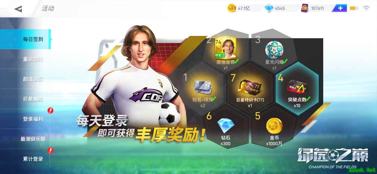 多重豪礼,累计登陆即送莫德里奇 测试期间,每天登陆即可获得丰厚奖励,钻石、金币、球探券将加快你的球队建设速度。巨星特训卡以及突破点数助你培育更强球星。登录次日即可签约世界足球先生强力中前卫莫德里奇。测试充值,公测将可获得最高200%返利,养成资源礼包限时上架,更有【巨星集结】等精选球探轮番登场!更多活动详情,可登录游戏查阅公告。