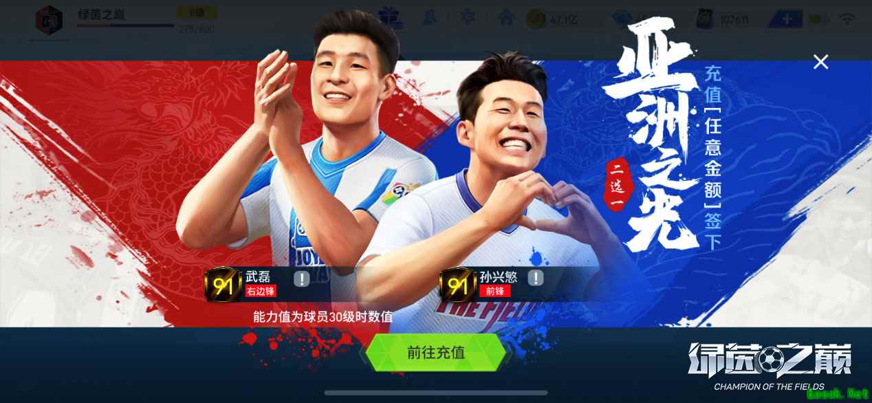 不断迭代优化的匹配机制,可以让实力相当的玩家同场竞技,减少玩家队伍实力带来的差距。兼容市面上绝大多数市场机型以及底层网络架构的优化,使其在线匹配对战更加流畅,即便在对方网络环境不佳的情况下,仍能顺畅完成比赛。 专属福利,亚洲之光闪耀绿茵 能在水平最高的欧洲足坛看到越来越多的亚洲面孔,对亚洲球迷来说无疑是幸福的。此次测试,亚洲之光将闪耀《绿茵之巅》!玩家只要在10月15日~11月1日测试期间充值任意金额,即可获得亚洲之光巨星球员免费签约机会,可在【亚洲之光】活动页面,选择签下武磊或孙兴慜两位球星中的一位。