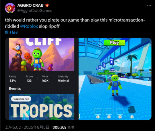 近期超人气登山游戏《PEAK》爆火,收益口碑双丰收,喜闻乐见的是各种“兄弟姐妹”全冒了出来,今天开发者AGGRO CRAB发帖吐槽,劣质仿游泛滥成灾,各种诱骗氪金,甚至宁愿玩家玩自家游戏盗版都好。 ![]() ·AGGRO CRAB发帖直接喊话罗布乐思,暗示平台在为大批劣质仿游推波助澜,这些劣质仿游打着致敬《PEAK》的名义,游戏品质不堪入目,而且各种氪金内购名义繁多,让工作室无奈且愤怒,甚至都不介意玩家去玩《PEAK》的盗版。 ·罗布乐思或许是由于平台的性质,各种人气游戏的仿制品多如牛毛,而且难以控制,这也是根深蒂固的难题,目前暂时没有好的解决办法。 ·一起看看比较有代表性的玩家回复: 与其在那些游戏氪金,不如直接买《PEAK》更省钱。 罗布乐思上的劣质氪金游戏正在欺骗大量儿童。 罗布乐思上也有版权侵犯申诉机制,理应取缔那些克隆垃圾。 官方主机板以及手游版《PEAK》一天不出,恐怕那些劣质仿游就不会停止骗钱。