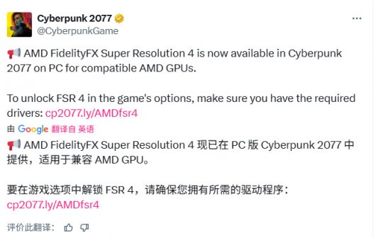 《赛博朋克2077》《四海兄弟:故乡》《明末:渊虚之羽》支持FSR 4