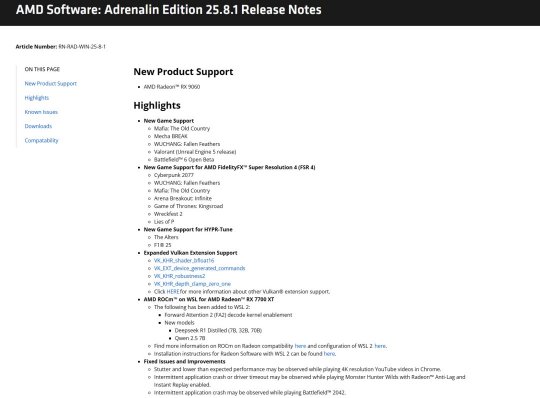 《赛博朋克2077》PC版终于加入了AMD FSR 4技术,如果玩家想要解锁FSR 4,需要安装A卡最新驱动Adrenalin 25.8.1。另外驱动更新日志后还提到《明末》、《四海兄弟:故乡》等游戏也已支持AMD FSR 4。 ![]() ![]() Adrenalin 25.8.1更新日志: 新增产品支持: AMD Radeon? RX 9060 新游戏支持: 《四海兄弟:故乡》 《解限机》 《明末:渊虚之羽》 《无畏契约》(虚幻5) 《战地6》BETA公测 FSR 4新增游戏支持: 《赛博朋克2077》 《明末:渊虚之羽》 《四海兄弟:故乡》 《暗区突围:无限》 《权力的游戏:国王之路》 《撞车嘉年华2》 《匹诺曹的谎言》 已知问题 在Radeon RX 6600系列显卡上游玩《Mafia: The Old Country》时可能出现画面损坏 在Radeon RX 7900系列显卡上游玩《最后的生还者2》时可能会偶发应用程序崩溃 在Radeon RX 9000系列显卡上游玩《使命召唤:黑色行动6》时可能会偶发应用程序崩溃 在Radeon RX 9000系列显卡上启用FSR 4游玩《明末:渊虚之羽》时,可能会偶发应用程序崩溃或驱动程序超时 在部分AMD Ryzen?处理器(如Ryzen? AI 300系列和Ryzen? 7000系列)上游玩《FBC: Firebreak》时可能会偶发应用程序崩溃 在Radeon RX 9070系列显卡上以生涯模式游玩《NBA 2K26》时可能会偶发应用程序崩溃