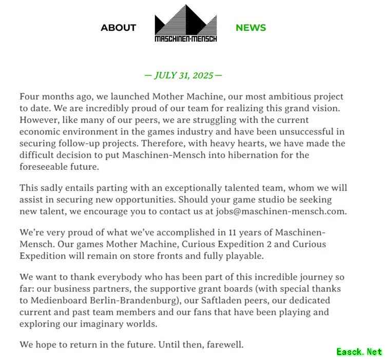 《奇妙探险队》开发商 Maschinen-Mensch 宣布,因受到游戏行业的经济环境影响,且未能成功争取到后续项目,工作室将暂时进入休眠状态,并将协助团队成员寻找新机会。《奇妙探险队1&2》以及今年3月推出的新作《遵命!机母大人》将继续在各平台销售,并保持完全可玩状态。 |