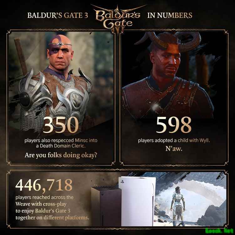 《博德之门3》正式版上线迎来了两周年,拉瑞安也分享了一些游戏中的趣味数据和玩家摄影作品。其中包括:·玩家们总计上传了8500个MOD,下载总量达2.65亿次;·350名玩家把明斯克转成了死亡领域牧师;·598名玩家和威尔收养了孩子(威尔当高公爵并且发展恋人关系的后日谈);·44万名玩家使用了跨平台联机功能;·110万玩家以硬核难度通关;·近5万玩家觉得荣誉模式很有趣,相比去年又多了31万个受到创伤的灵魂;·4647名玩家仅用1级角色就通关了荣誉模式,31180名玩家选择了兼职所有职业通关荣誉模式;·洗点最多的队友TOP3:影心(489万次)、威尔(141万次)、盖尔(68万次)。关于队友的转职偏好:·卡菈克——复仇之誓圣武士;·影心——死亡/生命领域牧师持平;·莱埃泽尔——王冠之誓圣武士;·盖尔——龙族血脉术士;·阿斯代伦&威尔——咒剑邪术师。冷门成就部分(达成玩家数量与对应成就):·1.82%“欢乐卖艺人”(通过演奏音乐在一次游戏中赚取一百金币);·2.07% “醉拳大师”(在一个角色醉酒时击败二十个对手);·3.87% “凌波微步”(在没有触发一个陷阱的情况下击败戈塔什);·2.30% “万金油”(在一次游戏中兼职所有职业,且未曾重塑职业);·6.24% “紧急迫降”(在雏龙之路,将飞行中的龙打落天空);·2.65%“放了她”(在一次游戏中从翠绿林地、地精营地和月出之塔解救萨扎);·超过5%“无人掉队”(在一次游戏中拯救所有能救的提夫林难民);·8.21%“一石二鸟”(用一个敌人作为临时武器揍另一个敌人)。