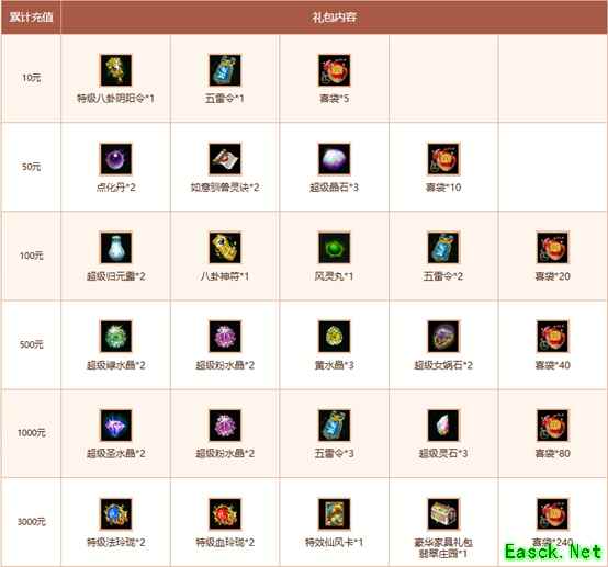 8月5日00:00-8月31日23:59期间,玩家累计充值达到10元、50元、100元、500元、1000元、3000元金额,可获得累计充值礼包。
