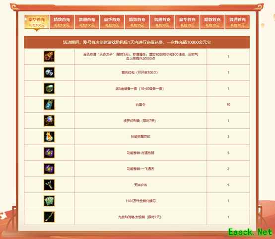 8月5日00:00-9月14日23:59在经典情怀版联运大服“二〇二五”首次一次性充值兑换1000金元宝、3000金元宝或者10000金元宝可获得对应首充礼包。 账号首次创建角色后的1天内充值兑换,即可获得豪华首充礼包,1-3天内充值兑换即可获得精致首充礼包,3天后充值兑换即可获得普通首充礼包。如您在新服对外开放前,首充额度达到相应首充条件,则必定会获得对应的豪华首充礼包。