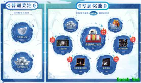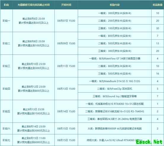 专属奖池开奖前未在新服预充值满100元的账号绑定抽奖码后仅可参与普通奖池抽奖。(普通奖池开奖时间:8月18日12:00) 游戏分数争榜玩法:天墉城游戏排行榜截止至8月18日12:00定榜,定榜后排行榜前十的玩家可享有对应的京东卡奖励,排行第一名的玩家将会赢得1000元京东卡。 【预充值大派送】